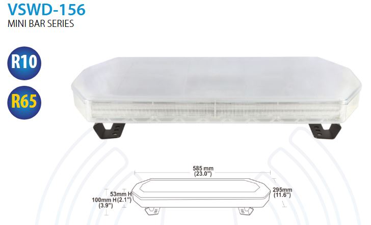 VSWD 156 LED Mini Bar 200 LED's, 9-30 V, Festmontage 26 diverse Blitzmuster klare Haube Gelb L: 585 mm, B: 295 mm, H: 100 mm (mit Befestigungsbügel) 53 mm (ohne Befestigungsbügel) Preise auf Anfrage Zulassung ECE R 65 / R10 |