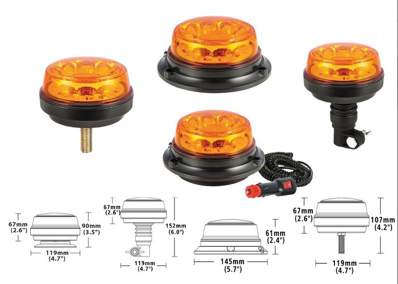 RKLE 200 Serie - gelbe, rote oder blaue* Haube - Halogen H1 - A: DIN (D: 13.5 cm / H: 24,5 cm) - B1: Festmontage (D: 15 cm / H: 20 cm) - B2: Festmontage (Übergrösse) (D: 22.5 cm / H: 22.5 cm) - D: Magnet Montage (250 kmh) mit Zigarettenanzünder (D: 15.2 cm / H: 21.3 cm) - 12 oder 24 Volt - ECE R65 Zertifizierung Preise in CHF: auf Anfrage |