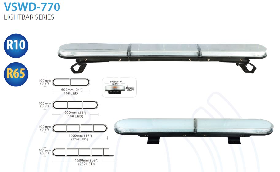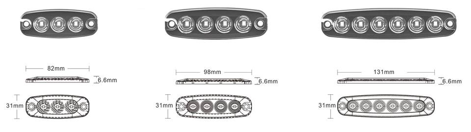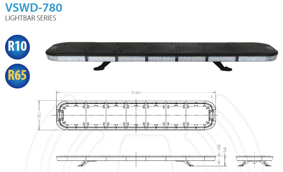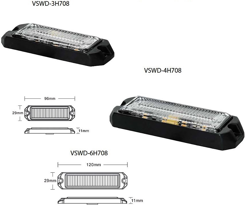 VSWD-707 Serie: Ultra-Dünn (nur 6.6mm) externe/interne Verwendung wasserdicht 12/24 Volt Gelb, Blau, Weiss, Rot, Grün interne Blitzelektronik, kein zusätzliches Steuergerät nötig diverse Blitzmuster Zulassung ECE R65 / R10 Preise auf Anfrage VSWD-3H707: 3 LED's L: 82 mm / H: 31 mm / T: 6.6 mm VSWD-4H707: 4 LED's L: 98 mm / H: 31 mm / T: 6.6 mm VSWD-6H707: 6 LED's L: 131 mm / H: 31 mm / T: 6.6 mm |