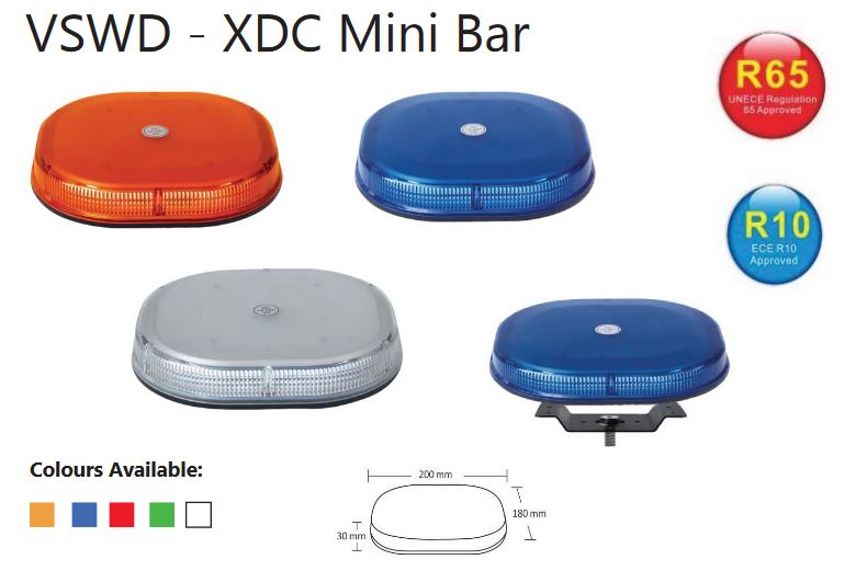 VSWD-190 LED Mini Bar XDC 12/24V, Magnethaftung, Anschluss am Zigarettenanzünder oder Festmontage diverse Blitzmuster Gelb (klare Haube) Blau (blaue Haube) Dualcolor gelb/blau (klare Haube) L: 200 mm, B: 180 mm, H: 30 mm Preise auf Anfrage Zulassung ECE R 65 / R10 |